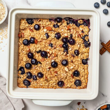 Baked oatmeal is also endlessly customizable. Blueberries, peaches, chocolate chips, walnuts, lemon zest, every combo works. And once it's baked, you can serve it warm, cold, creamy, drizzly, fruity, chocolatey… whatever you're in the mood for.